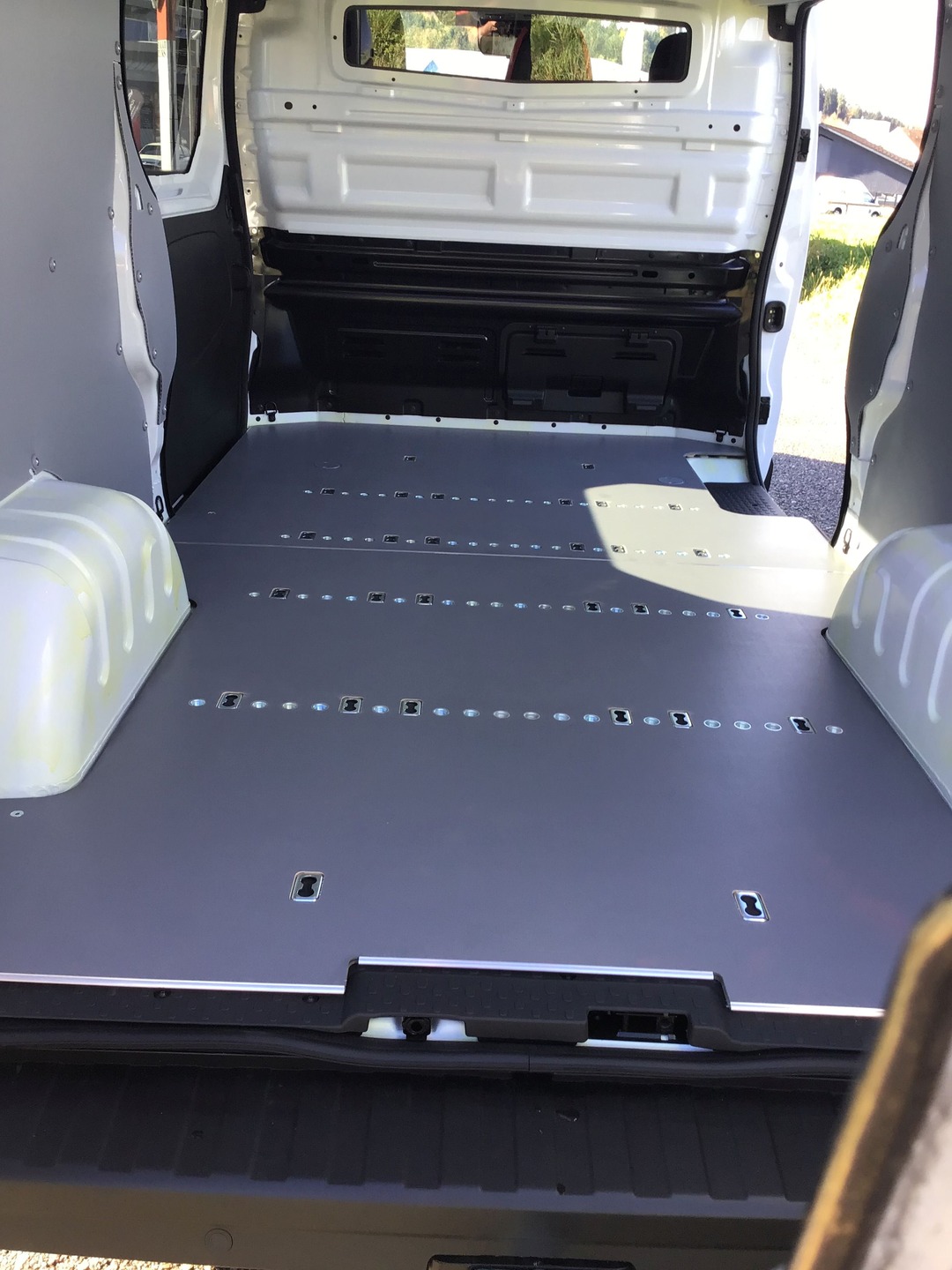 - Holzabdeckung bei Stirnwand mit Zurrschiene